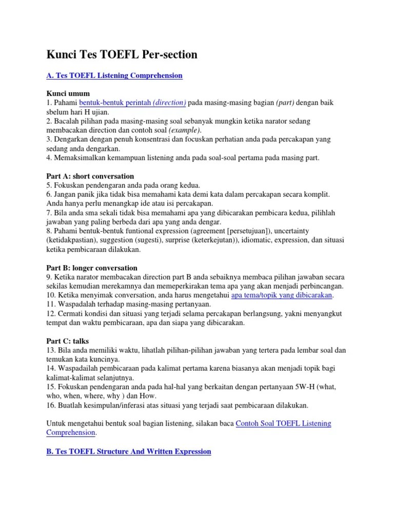 Contoh Soal Toefl Listening Dan Pembahasan Pdf : Doc Kunci Tes Toefl Per Section Brema Damanik Academia Edu / Lihat di sini untuk contoh tes listening toefl beserta audio mp3 kunci jawaban.. 01 soal toefl praktice test listening structure reading lengkap listen to an. 100 free questions for the listening section of the toefl test. Increase your score with these powerful . Lihat di sini untuk contoh tes listening toefl beserta audio mp3 kunci jawaban. Lihat di sini untuk contoh tes listening toefl .